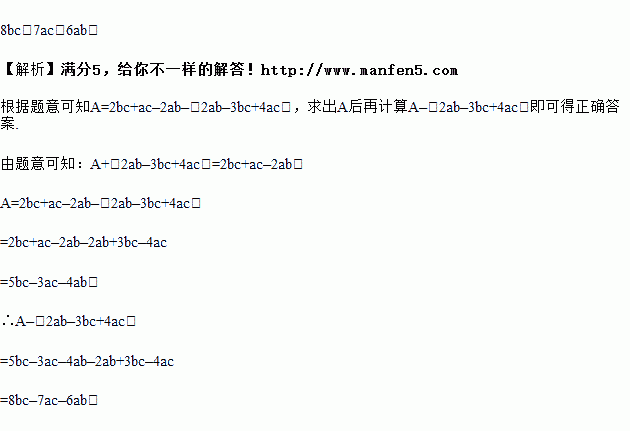 小刚在爬黑板时计算“一个整式A减去2ab-3bc+4ac”时,误把“减号”抄成了“加号”,得到了正确的结果是:2bc+ac-2ab.请你帮他求出整式A和此原题的正确答案.