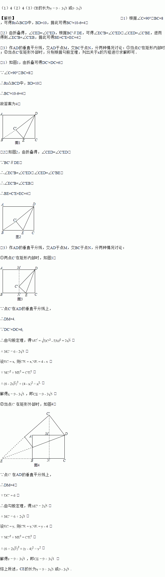 (3)若点C'刚好落在线段AD的垂直平分线上时,求CE的长.