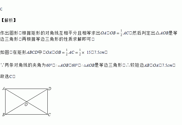 矩形的两条对角线的夹角为60°,对角线长为15cm,较短边的长为( )