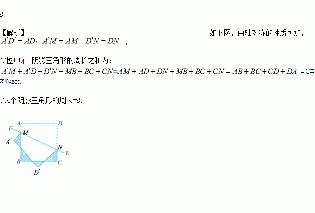 如图,已知正方形ABCD的边长为2,将正方形ABCD沿直线EF折叠,则图中折成的4个阴影三角形的周长之和为_____.