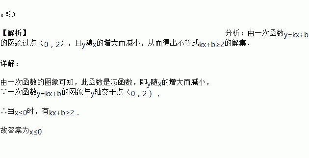 如图,已知一次函数y=kx+b的图象与x轴交于点(3,0),与y轴交于点(0,2),不等式kx+b≥2解集是_______.