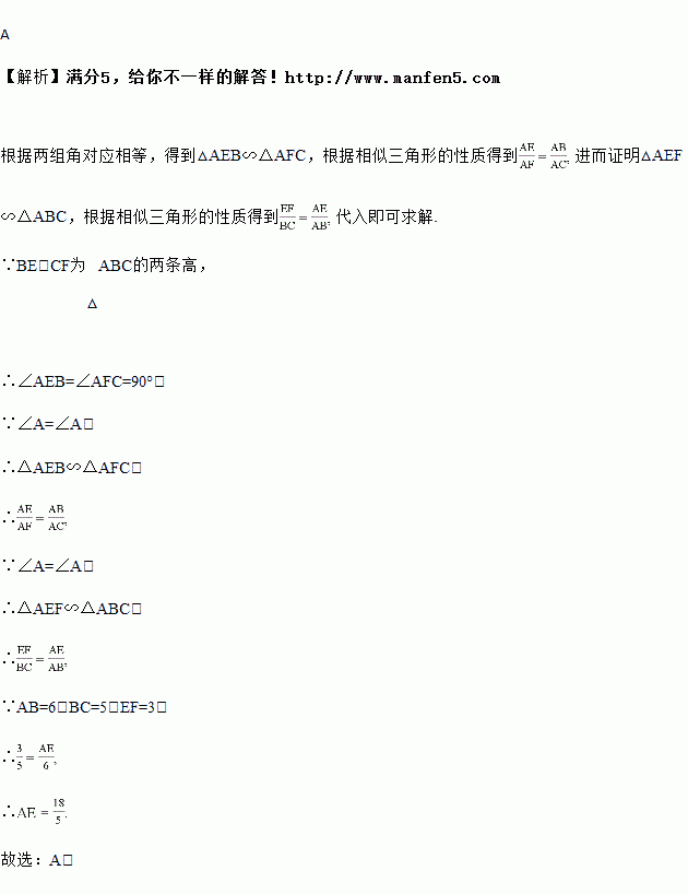 如图,BE,CF为△ABC的两条高,若AB=6,BC=5,EF=3,则AE的长为( )