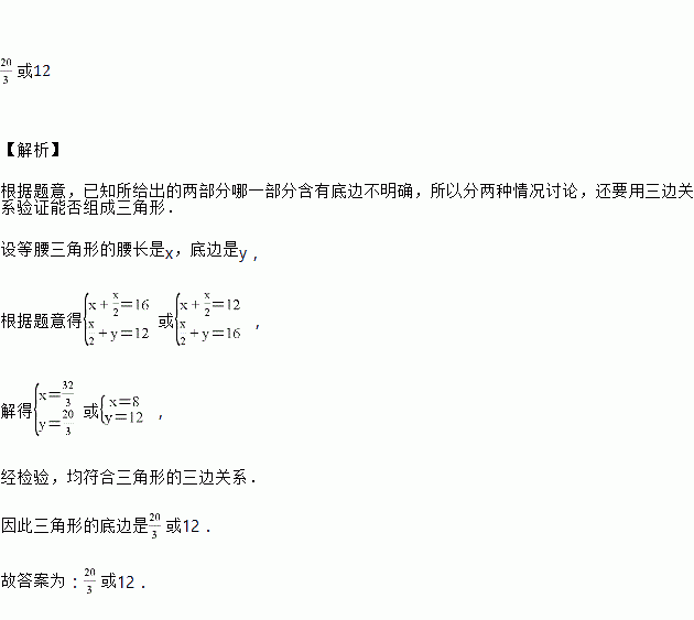 等腰三角形的一腰的中线把三角形的周长分成16cm和12cm,则等腰三角形的底边长为______ .
