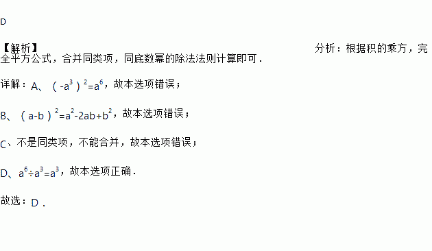 A. (﹣a3)2=﹣a6 B. (a﹣b)2=a2﹣b2 C. 3a2+2a3=5a5 D. a6÷a3=a3