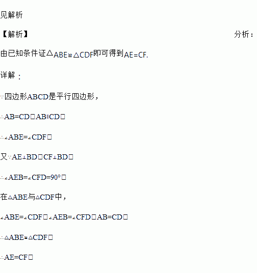 如图,在□ABCD中,AE⊥BD于E,CF⊥BD于F.求证:AE=CF.