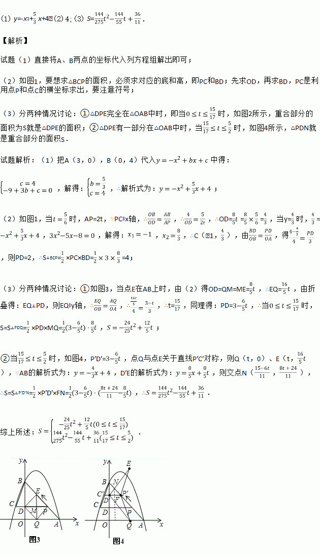 (3)如图2,动点P从A出发时,动点Q同时从O出发,在线段OA上沿O→A的方向以每秒1个单位长度的速度运动,当点P与B重合时,P、Q两点同时停止运动.连接DQ,PQ,将△DPQ沿直线PC折叠得到△DPE.在运动过程中,设△DPE和△OAB重合部分的面积为S,直接写出S与t的函数关系式及t的取值范围.