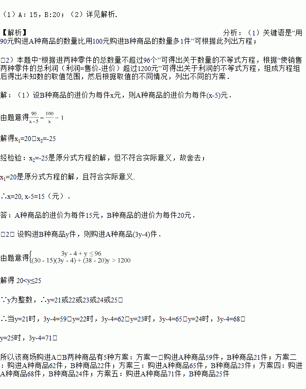 (2)若该商场购进A种商品的数量是B种商品数量的3倍少4 件,两种商品的总件数不超过96件;A种商品的销售价格为每件30元,B种商品的销售价格为每件38元,两种商品全部售出后,可使总利润超过1200元.该商场购进A、B两种商品有哪几种方案?
