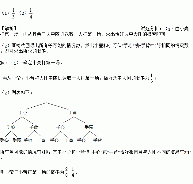 (1)(2) 【解析】试题分析:(1)由小亮打第一场,再从其余三人中随机选取一人打第一场,求出恰好选中大刚的概率即可; (2)画树状图得出所有等可能的情况数,找出小莹和小芳伸“手心”或“手背”恰好相同的情况数,即可求出所求的概率. 【解析】 (1)∵确定小亮打第一场, ∴再从小莹,小芳和大刚中随机选取一人打第一场,恰好选中大刚的概率为; (2)列表如下: 所有...