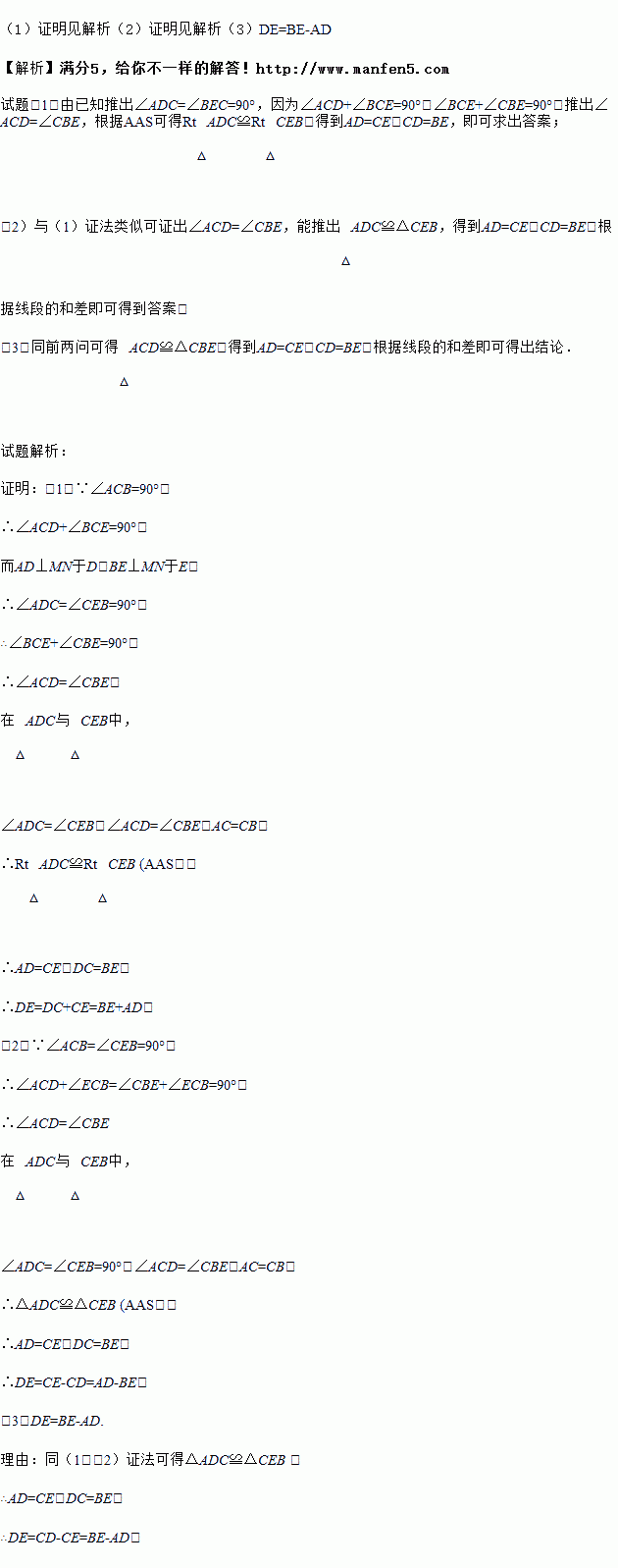 (3)当直线MN绕点C旋转到图(3)的位置时,试问DE、AD、BE具有怎样的等量关系?请直接写出这个等量关系.