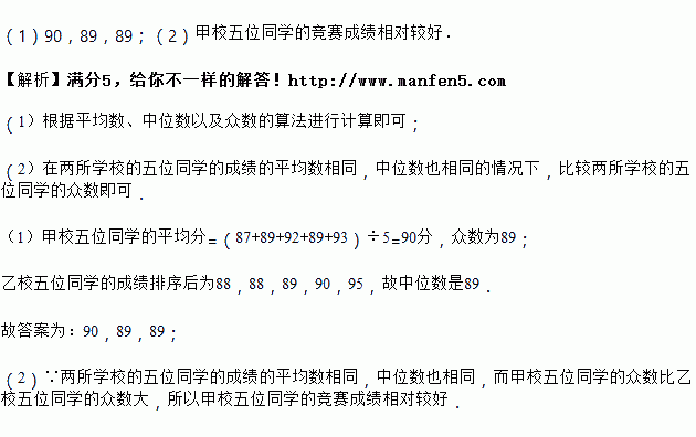 我市举行八年级“生活中的数学知识”竞赛活动,甲、乙两校分别派五名同学参加竞赛,其成绩分别是(单位:分):甲校五名同学:,![]()