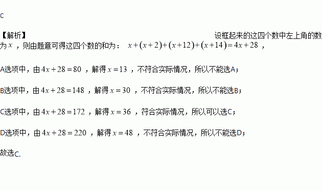 已知一个由50个偶数排成的数阵.用如图所示的框去框住四个数,并求出这四个数的和.在下列给出备选答案中,有可能是这四个数的和的是( )