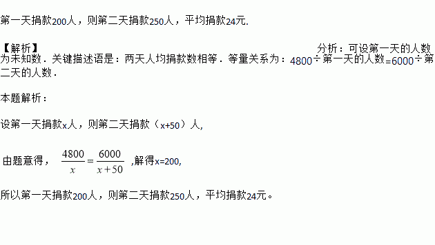 第一天捐款200人,则第二天捐款250人,平均捐款24元. 【解析】分析:可设第一天的人数为未知数.关键描述语是:两天人均捐款数相等.等量关系为:4800÷第一天的人数=6000÷第二天的人数. 本题解析: 设第一天捐款x人,则第二天捐款(x+50)人, 由题意得, ,解得x=200, 所以第一天捐款200人,则第二天捐款250人,平均捐款24元。