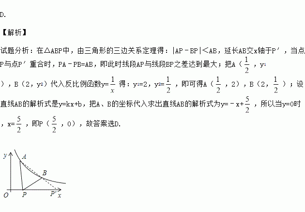 图象上的两点,动点P(x,0)在x轴正半轴上运动,当线段AP与线段BP之差达到最大时,点P的坐标是( )