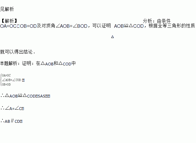 如图,AC和BD相交于点O,OA=OC,OB=OD,求证:AB∥CD.