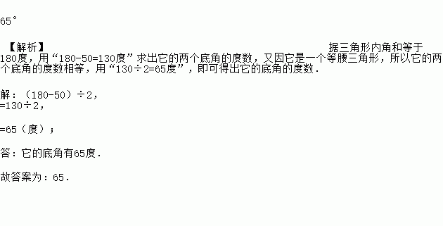 等腰三角形的顶角为50°,则它的底角为 ▲ .