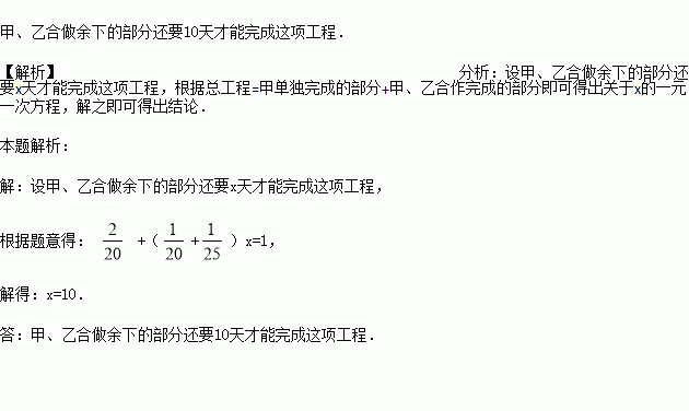一项工程,甲单独完成要20天,乙单独完成要25天,现由甲先做2天,然后甲、乙合做余下的部分还要多少天才能完成这项工程.