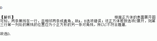 如图的正方体盒子的外表面上画有3条黑线,将这个正方体盒子的表面展开(外表面朝上),展开图可能是( )