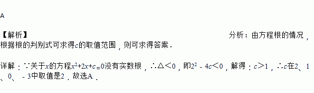 如果关于x的方程没有实数根,那么c在2、1、0、中取值是( )
