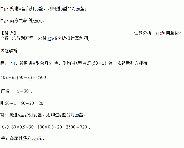 (1)购进A型台灯30盏,则购进B型台灯20盏; (2)商家共获利720元. 【解析】试题分析:(1)利用单价个数=总价列方程,求解.(2)按照折扣计算利润. 试题解析: 【解析】 (1)设购进A型台灯盏,则购进B型台灯盏,依题意列方程得: , 解得: . 则, 答:购进A型台灯30盏,则购进B型台灯20盏. (2), 答:商家共获利7...