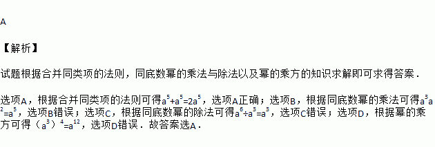 A. a5+a5=2a5 B. a3a2=a6 C. a6÷a3=a2 D. (a3)4=a7