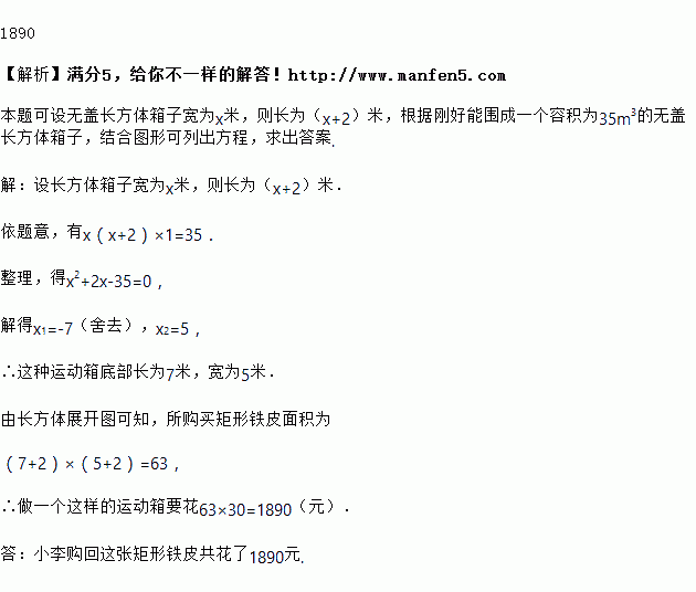 如图,小李从市场上买回一块矩形铁皮,他将此矩形铁皮的四个角各剪去一个边长为1米的正方形后,剩下的部分刚好能围成一个容积为35 m3的无盖长方体箱子,且此长方体箱子的底面长比宽多2m,现己知购买这种铁皮每平方米需30元钱,问小李购回这张矩形铁皮共花了多少元钱?