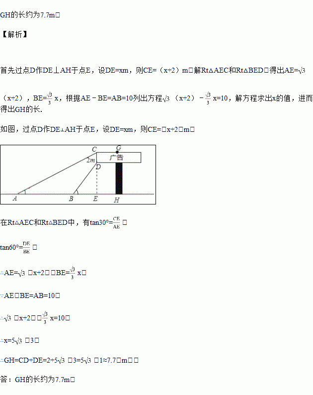 数学社团小组想利用所学的知识了解某广告牌的高度(图中GH的长),经测量知CD=2m,在B处测得点D的仰角为60°,在A处测得点C的仰角为30°,AB=10m,且A、B、H三点在一条直线上,请根据以上数据计算GH的长(