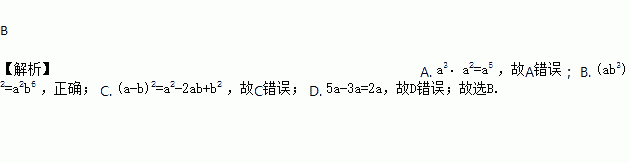 A. a3﹒a2=a6 B. (ab3)2=a2b6 C. (a-b)2=a2-b2 D. 5a-3a=2