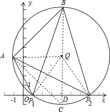 解:作BC⊥x轴,且BC=10,连接AC,作△ABC的外接圆Q,连接AQ,交x轴于P1、P2,