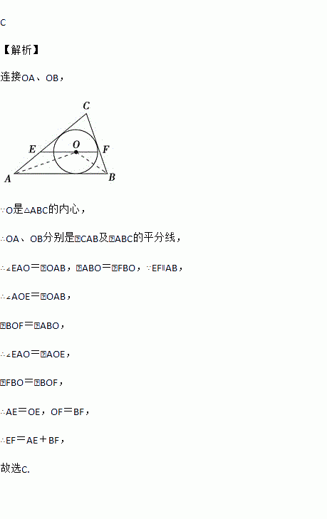 如图,O是△ABC的内心,过点O作EF∥AB,与AC、BC分别交E、F,则____