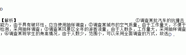D 【解析】①调查某批汽车的抗撞击能力,由于具有破坏性,应当使用抽样调查;②调查某城市的空气质量,由于工作量大,不便于检测,采用抽样调查;③调查某风景区全年的游客流量,由于人数多,工作量大,采用抽样调查;④调查某班学生的身高情况,由于人数少,范围小,可以采用全面调查的方式,故选D.