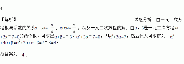 4 【解析】试题分析:由一元二次方程根与系数的关系x1+x2=-,x1•x2=,以及一元二次方程的解,由α,β是一元二次方程x2+3x﹣7=0的两个根,可求出α+β=﹣3,α2+3α﹣7=0,即α2+3α=7,然后代入可求解为:α2+4α+β=α2+3α+α+β=7﹣3=4, 故答案为:4.
