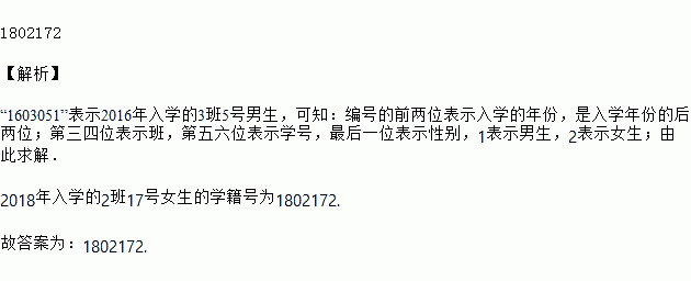 学校为每个学生编学籍号,规定尾号“1”表示男生,“2”表示女生,如“1603051”表示2016年入学的3班5号男生,那么2018年入学的2班17号女生的学籍号为____________.