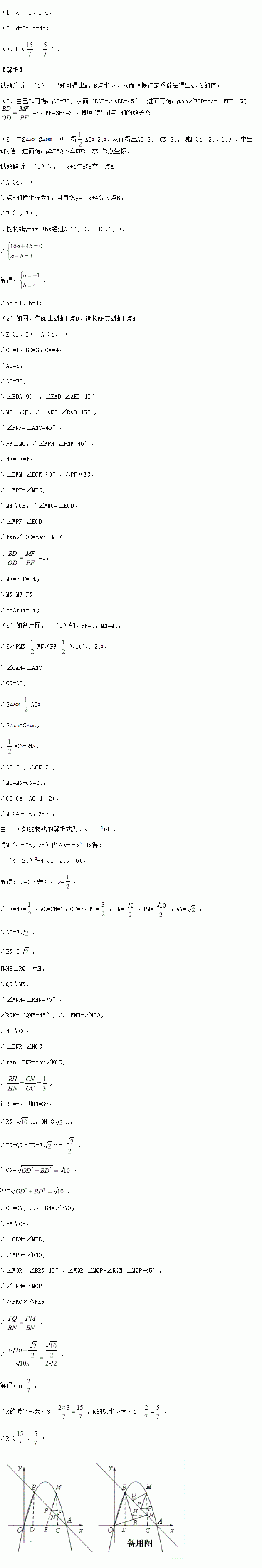 (2)点P是线段AB上一动点(点P不与点A、B重合),过点P作PM∥OB交第一象限内的抛物线于点M,过点M作MC⊥x轴于点C,交AB于点N,过点P作PF⊥MC于点F,设PF的长为t,MN的长为d,求d与t之间的函数关系式(不要求写出自变量t的取值范围);