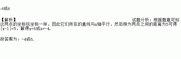 在平面直角坐标系中,若点M(1,3)与点N(x,3)之间的距离是5,则x的值是________.