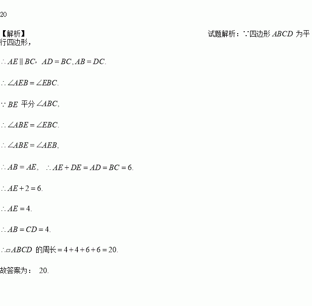 如图,在ABCD中,BE平分∠ABC,BC=6,DE=2.则ABCD的周长等于________.