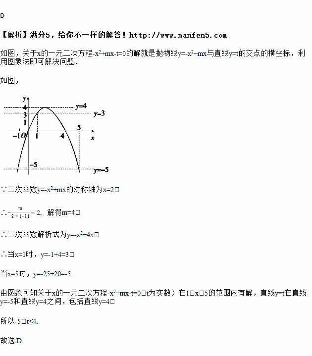 二次函数y=﹣x2+mx的图象如图,对称轴为直线x=2,若关于x的一元二次方程﹣x2+mx﹣t=0(t为实数)在1<x<5的范围内有解,则t的取值范围是( )