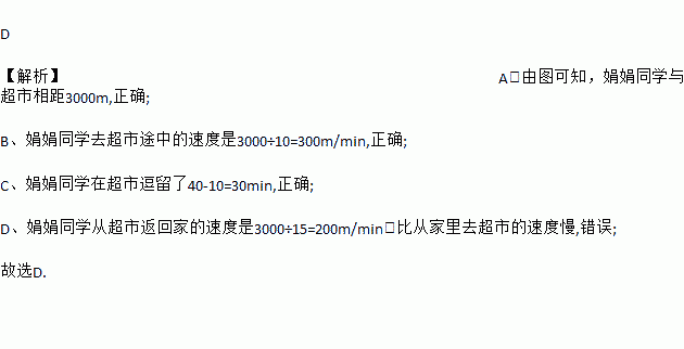 A. 娟娟同学家与超市相距3 000 m B. 娟娟同学去超市途中的速度是300 m/min