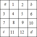 分析:画出4×4方格纸,设出四角所放的四个数分别为a、b、c、d,其它12个数分别为1、2、3、4、5、6、7、8、9、10、11、12这些数字代表,由每一行,每一列,每一对角线的四个数之和都等于1998,列出等式即可解答.