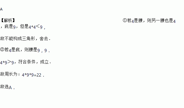 若等腰三角形的两边长分别为4和9,则它的周长为( )