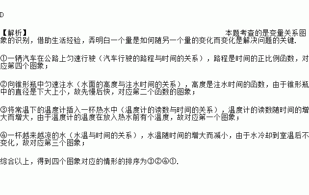 D 【解析】本题考查的是变量关系图象的识别,借助生活经验,弄明白一个量是如何随另一个量的变化而变化是解决问题的关键. ①一辆汽车在公路上匀速行驶(汽车行驶的路程与时间的关系),路程是时间的正比例函数,对应第四个图象; ②向锥形瓶中匀速注水(水面的高度与注水时间的关系),高度是注水时间的函数,由于锥形瓶中的直径是下大上小,故先慢后快,对应第二个函数的图象; ③将常温下的温度计...