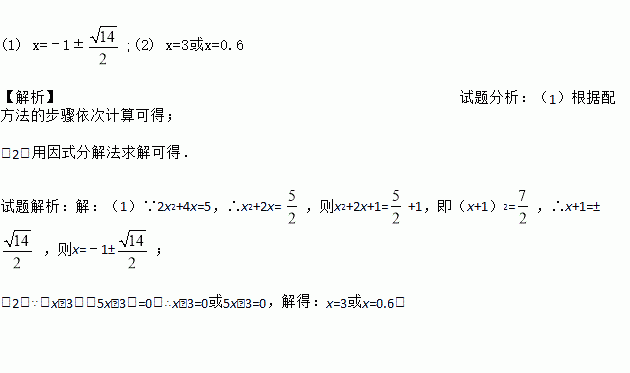 (1) x=﹣1±;(2) x=3或x=0.6 【解析】试题分析:(1)根据配方法的步骤依次计算可得; (2)用因式分解法求解可得. 试题解析:【解析】 (1)∵2x2+4x=5,∴x2+2x= ,则x2+2x+1=+1,即(x+1)2=,∴x+1=± ,则x=﹣1±; (2)∵(x﹣3)(5x﹣3)=0,∴x﹣3=0或5x﹣3=0,解得:x=3或x=0.6. ...