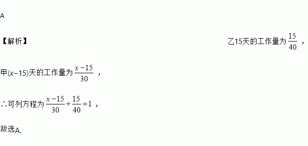 某项工程,甲单独做30天完成,乙单独做40天完成,若乙先单独做15天,剩下的由甲完成,问甲、乙一共用几天完成工程?若设甲、乙共用天完成,则符合题意的是( )