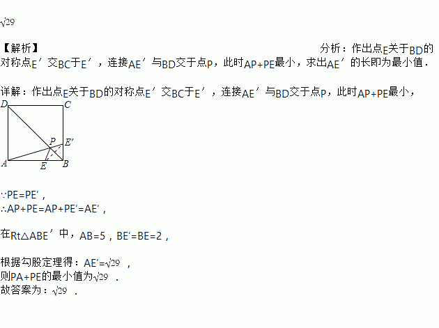 如图,正方形ABCD的边长为5,点E在边AB上,且BE=2.若点P在对角线BD上移动,则PA+PE的最小值是__________.