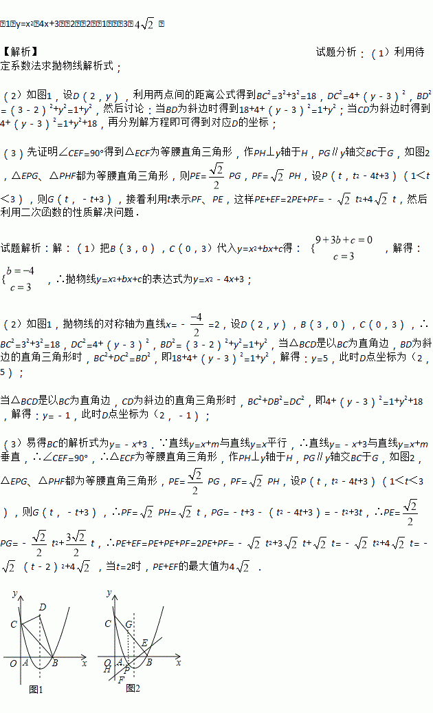 (3)点P在x轴下方的抛物线上,过点P的直线y=x+m与直线BC交于点E,与y轴交于点F,求PE+EF的最大值.