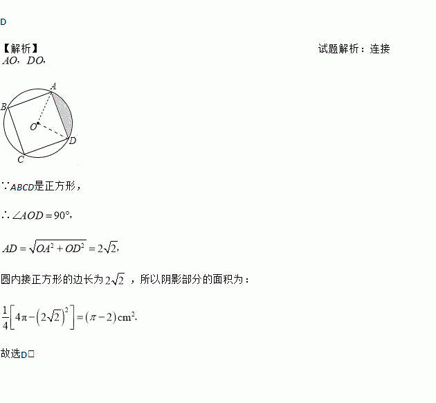 如图,正方形ABCD内接于半径为2的⊙O,则图中阴影部分的面积为( )