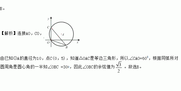 如图,直径为10的⊙A经过点C(0,5)和点O (0,0),B是y轴右侧⊙A优弧上一点,则cos∠OBC 的值为【 】