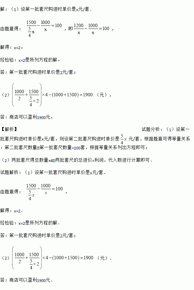 (2)若商店以每套4元的价格将这两批套尺全部售出,可以盈利多少元?