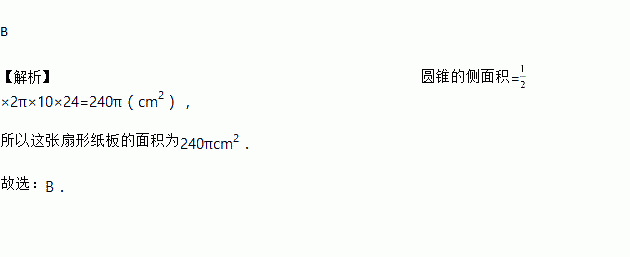 小洋用一张半径为24cm的扇形纸板做一个如图所示的圆锥形小丑帽子侧面(接缝忽略不计),如果做成的圆锥形小丑帽子的底面半径为10cm,那么这张扇形纸板的面积是( )