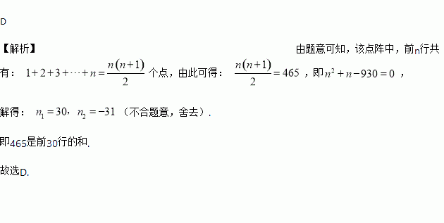 如图:一个三角点阵,从上向下有无数多行,其中第一行 1个点,第二行2个点 ……第行有个点……,若10 是前4行之和,则465是前( )行之和.