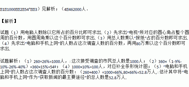 (4)若该市约有700万人,请你估计其中将“电脑上网和手机上网”作为“获取新闻的最主要途径”的总人数.